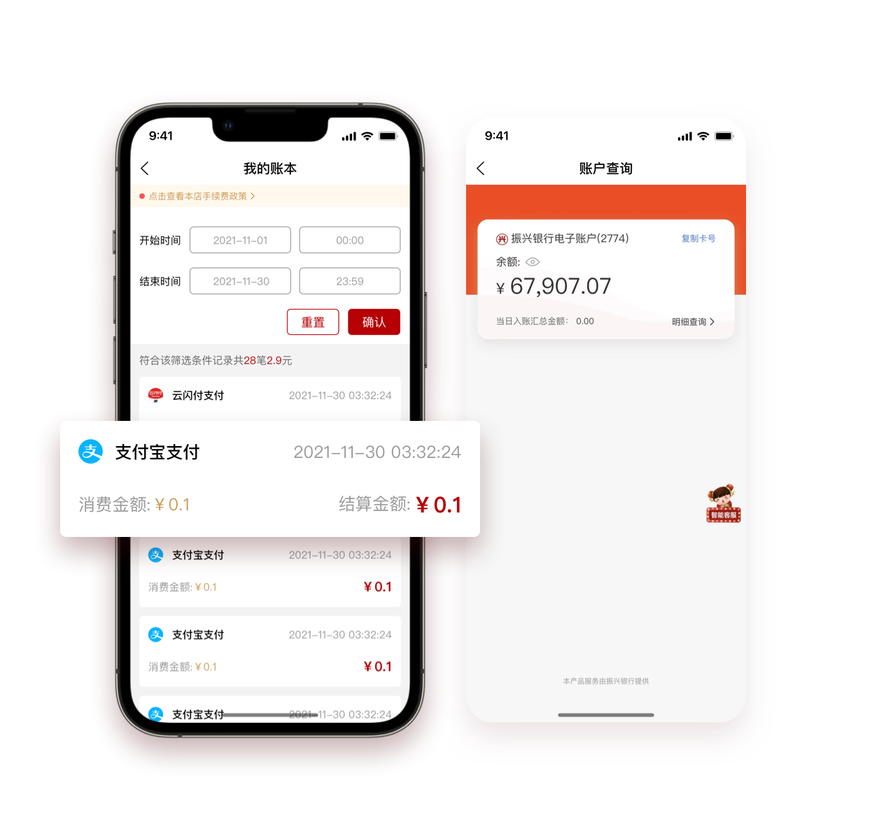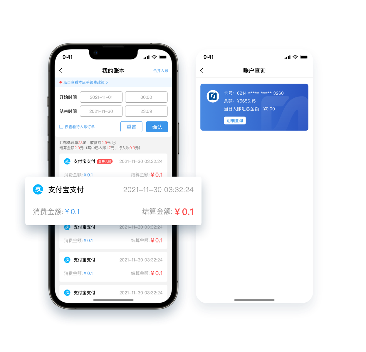 收款账本实时看,微信、支付宝、云闪付统一对账,银行卡余额明细数据实时查,简化商家对账工作