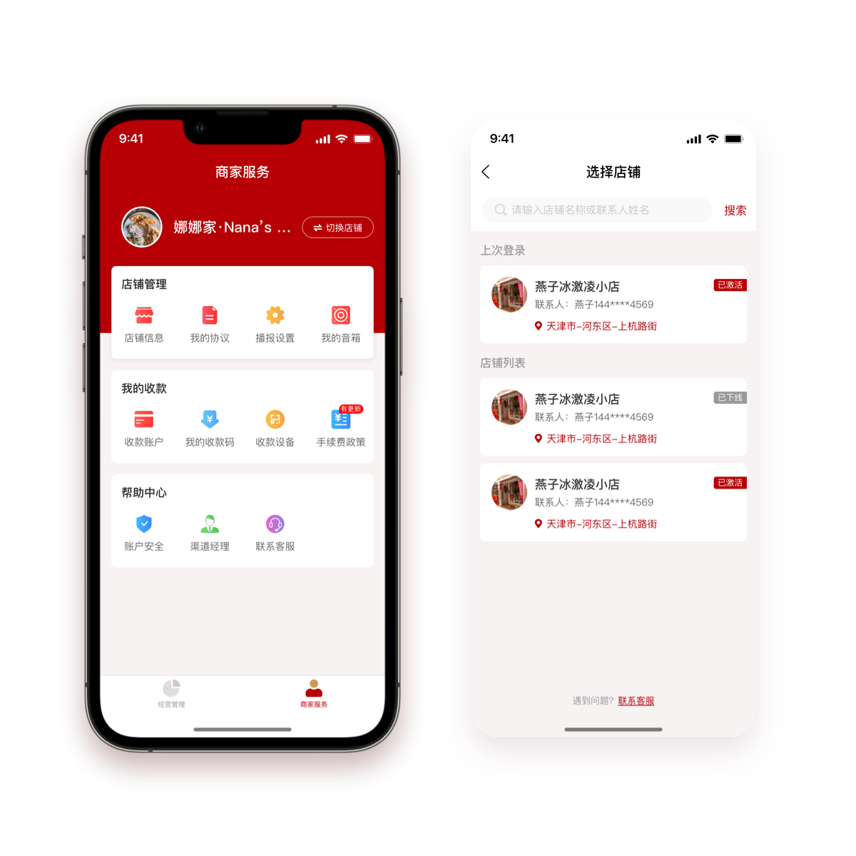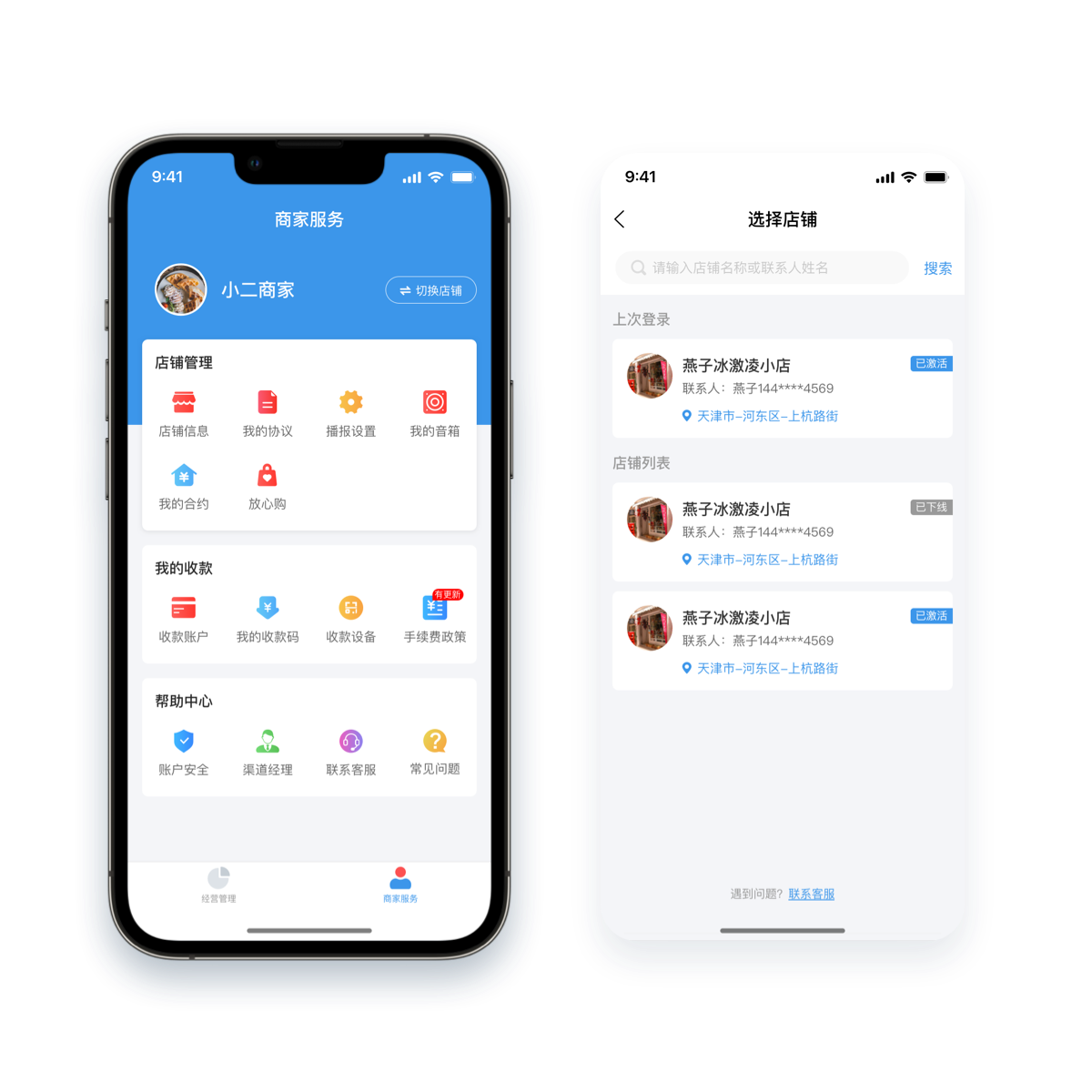商户使用手机号登录app,手机号下关联的多个店铺可以自由切换,使用更加方便